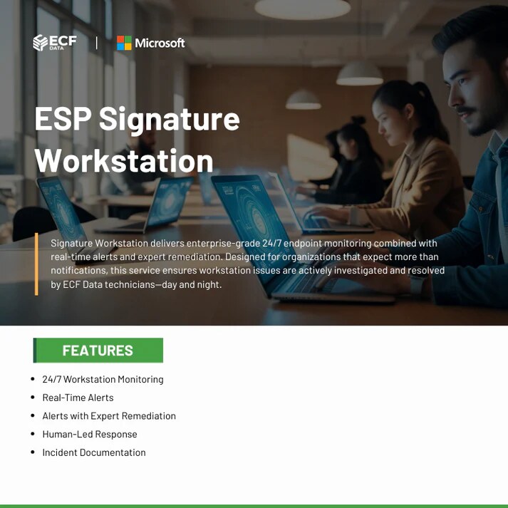 Improve your endpoint performance and security with ESP Signature Workstation from ECF Data. This service delivers 24/7 workstation monitoring, real-time alerts, and expert human-led remediation to resolve issues before they impact your operations.